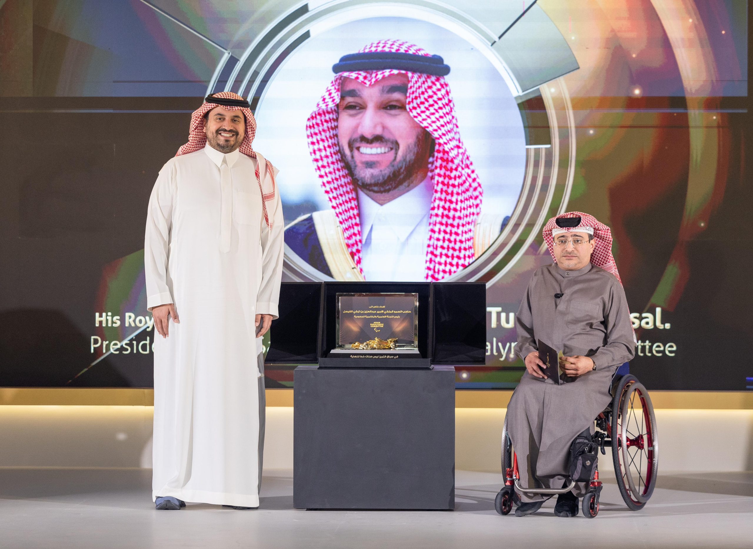 كرمت اللجنة البارالمبية الاسيوية، رئيس اللجنة الأولمبية والبارالمبية السعودية صاحب السمو الملكي الأمير عبدالعزيز بن تركي الفيصل، بالجائزة التقديرية البارالمبية الاسيوية نظير دعم واهتمام سموه؛ بالرياضة البارالمبية في المملكة -بشكل خاص- والقارة الاسيوية -بشكل عام- على النحو الذي أسهم في زيادة التطور والاهتمام بهذه الرياضة في مختلف دول آسيا، وتسلمها نيابة عنه سمو نائبه الأمير فهد بن جلوي بن عبدالعزيز بن مساعد.