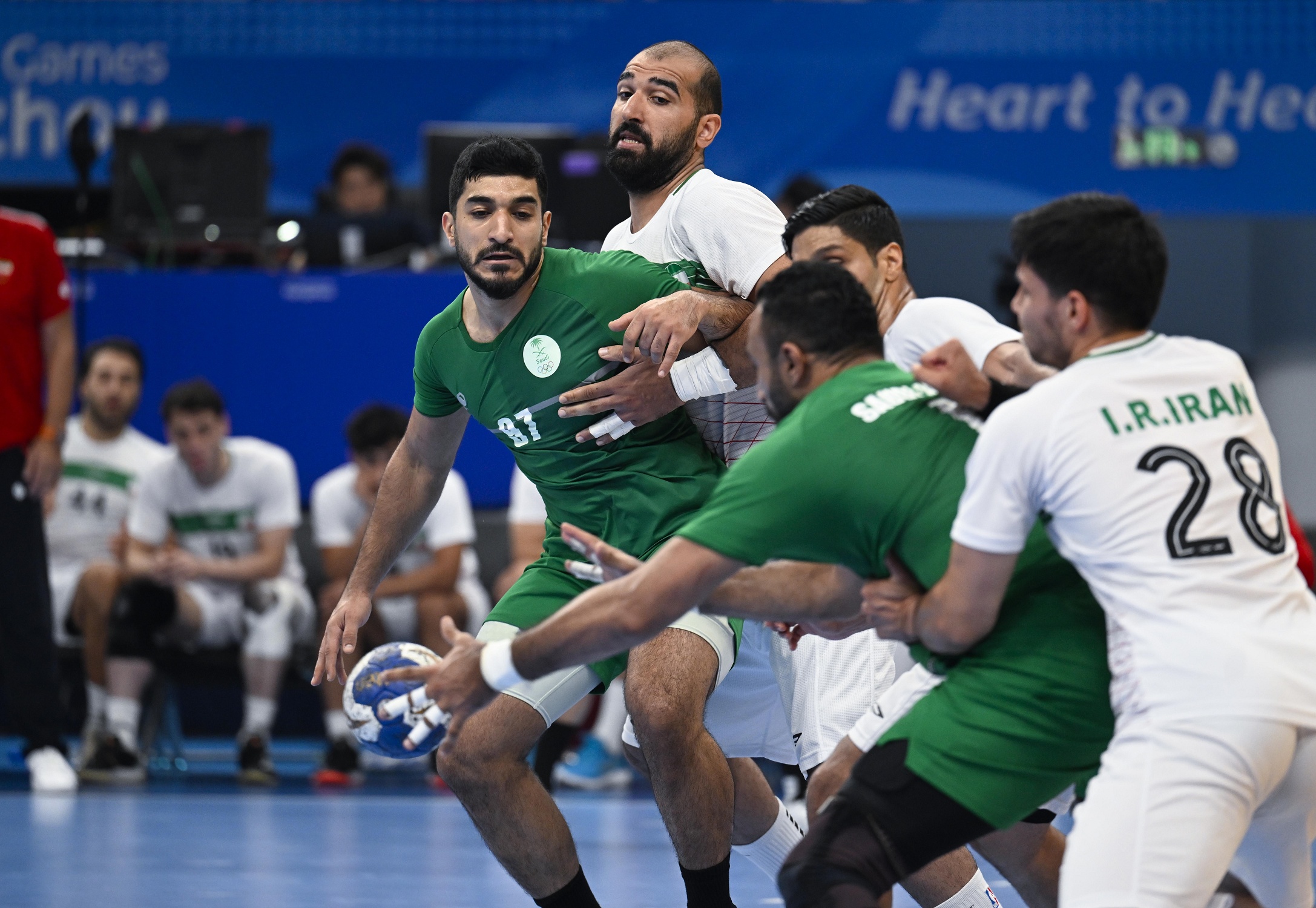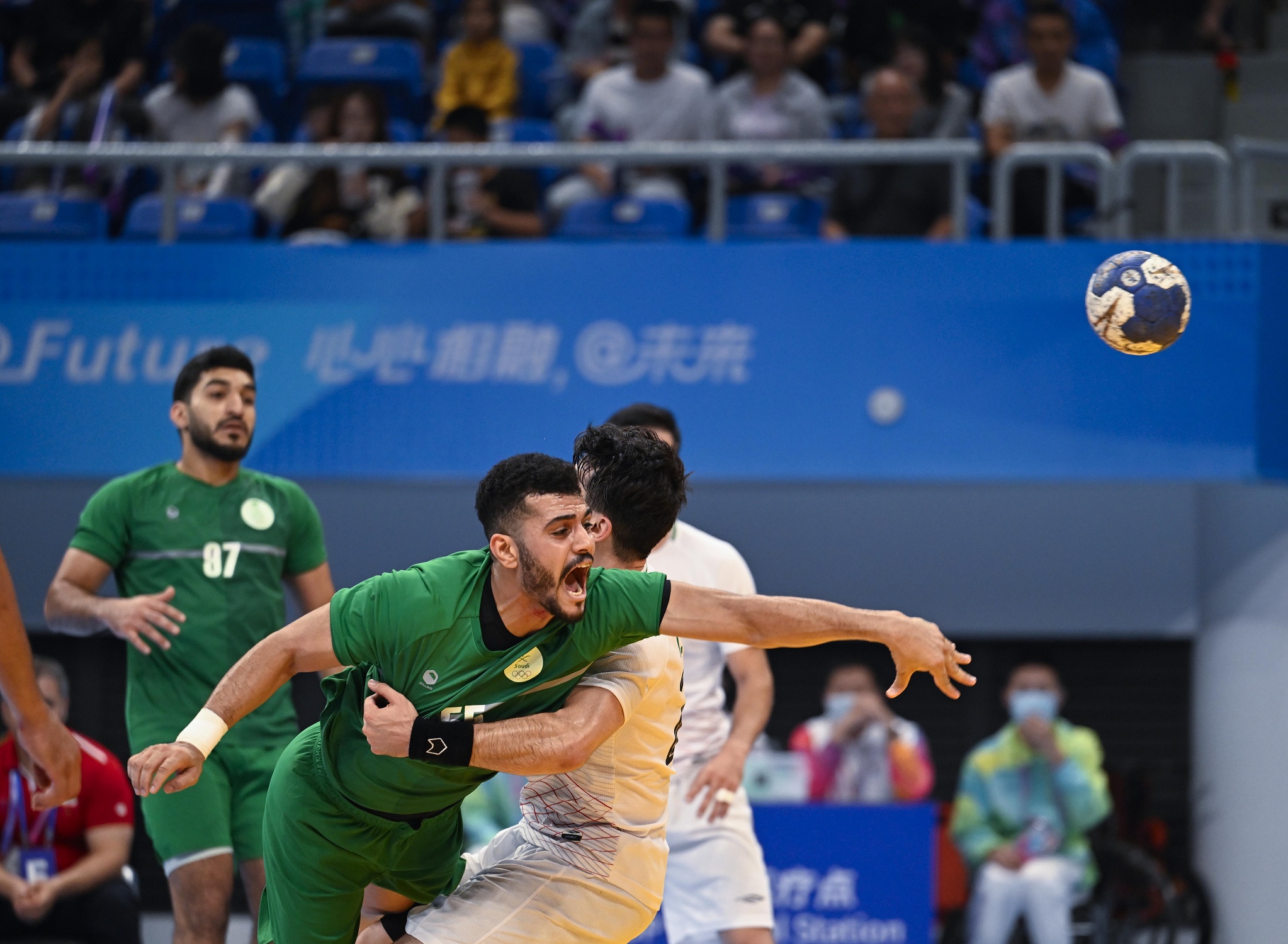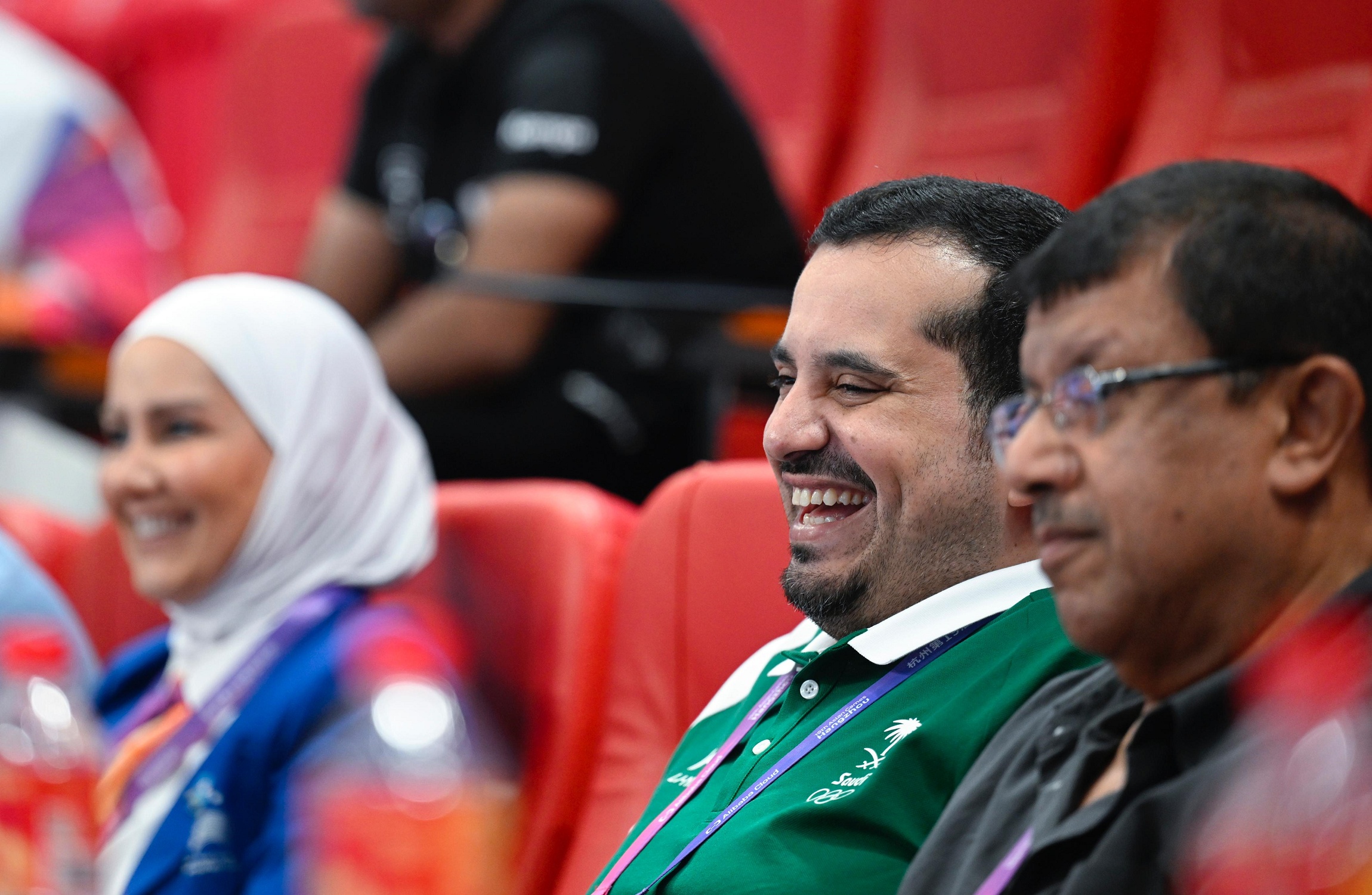 فيما تواجد سمو نائب رئيس اللجنة الأولمبية والبارالمبية السعودية نائب رئيس الوفد السعودي الأمير فهد بن جلوي بن عبدالعزيز بن مساعد، في مباراة المنتخب السعودي لكرة اليد أمام المنتخب الإيراني التي جرت ظهر اليوم ضمن مواجهات المجموعة الرابعة لمسابقة كرة اليد على صالة مركز الرياضات بجامعة (gongshang) بهانغتشو.
