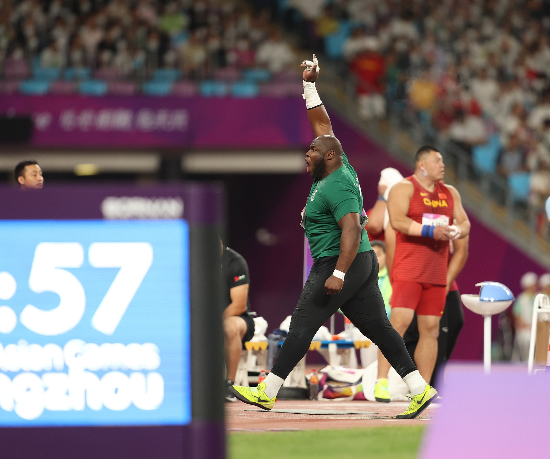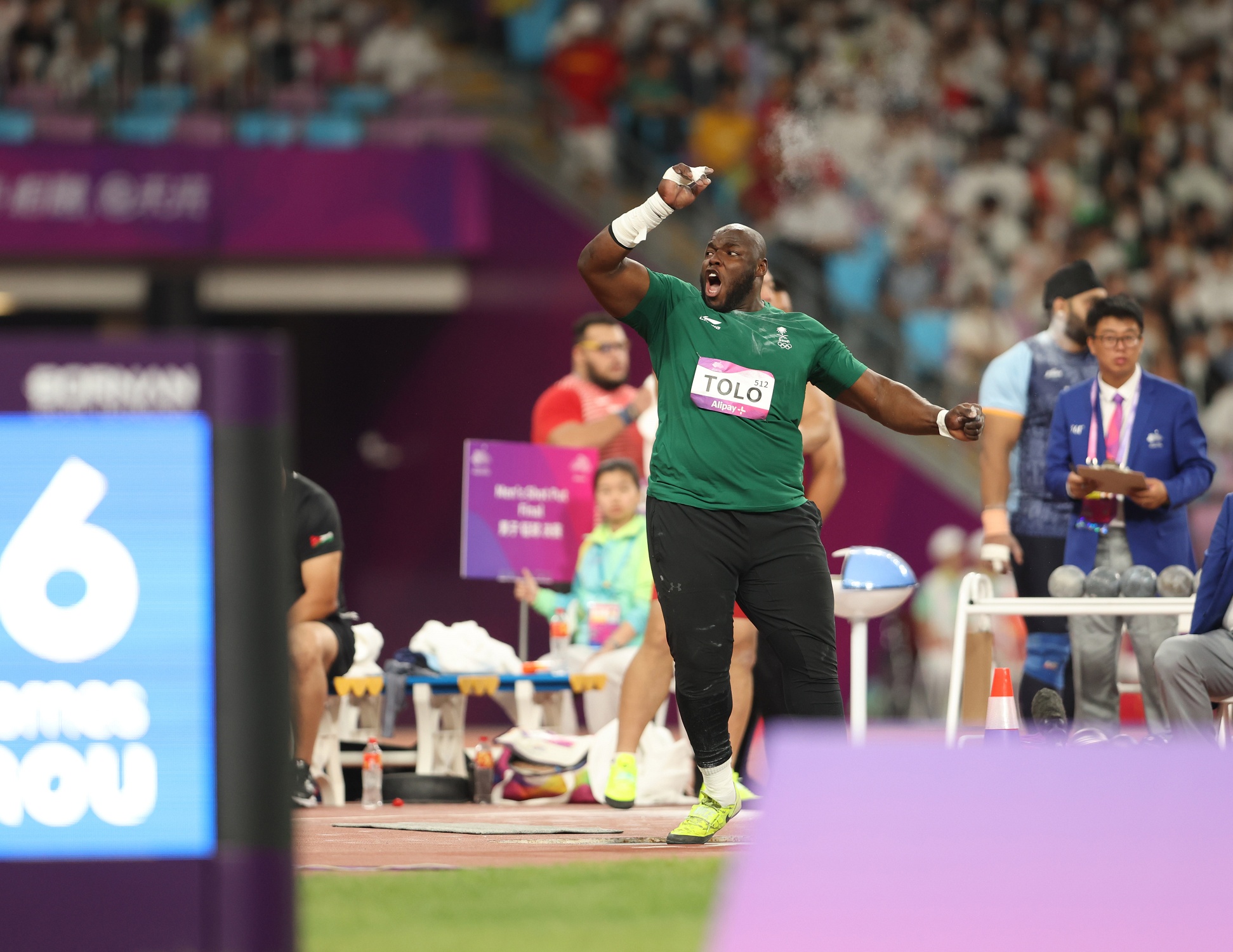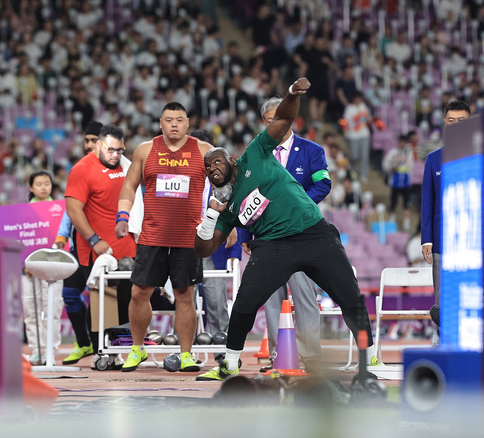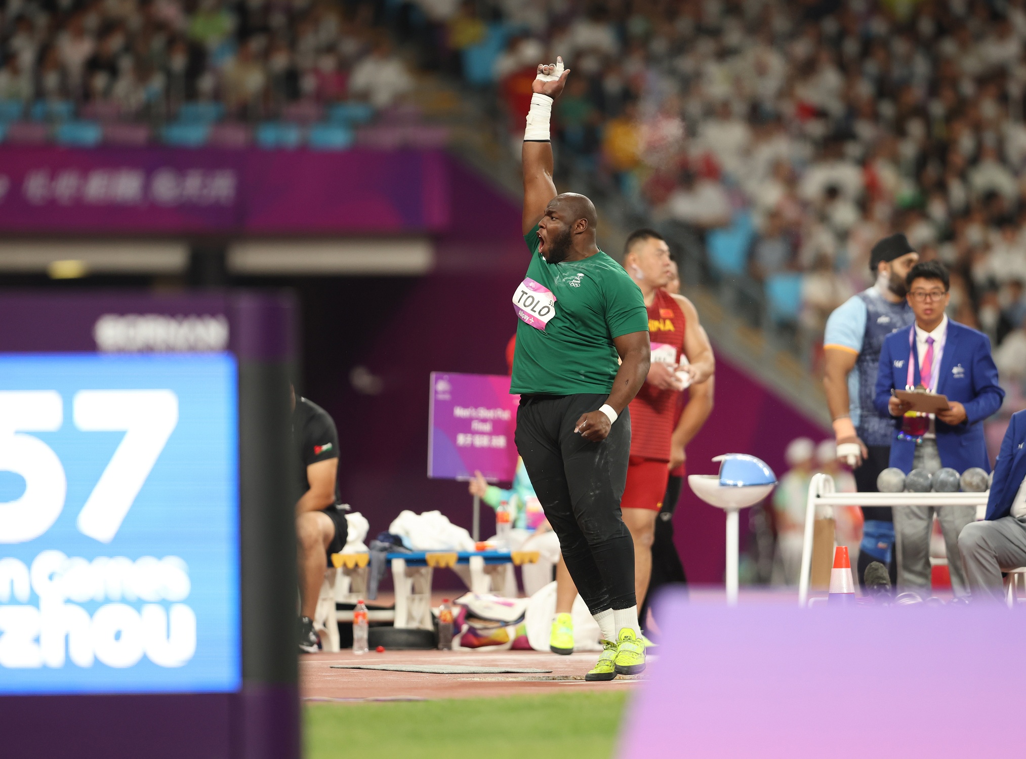 وجاءت الرمية الحاسمة في المحاولة الثالثة عندما رمى لمسافة 20.18م وظل محافظاً على الصدارة؛ حتى المحاولة الأخيرة -السادسة- للهندي “تور” عندما رمى رمية حاسمة منتزعاً بها الميدالية الذهبية بمسافة 20.36م، تاركاً الفضية لتولو، والبرونزية للصيني ليو بـ19.97م.