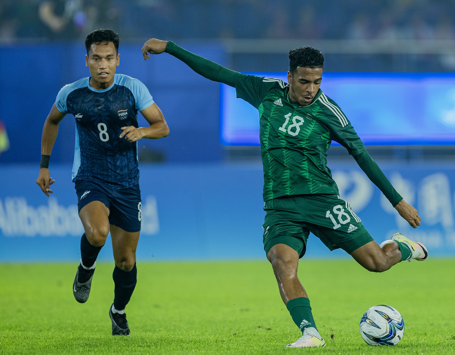تأهل المنتخب السعودي لكرة القدم تحت 23 سنة، لربع نهائي مسابقة كرة القدم في دورة الألعاب الاسيوية التاسعة عشر المقامة في مدينة هانغتشو الصينية، بعد فوزه اليوم على نظيره الهندي بثنائية نظيفة بحضور نائب رئيس اللجنة الأولمبية والبارالمبية السعودية سمو الأمير فهد بن جلوي بن عبدالعزيز بن مساعد ومدير الوفد الأمير عبدالله بن فهد بن عبدالله.