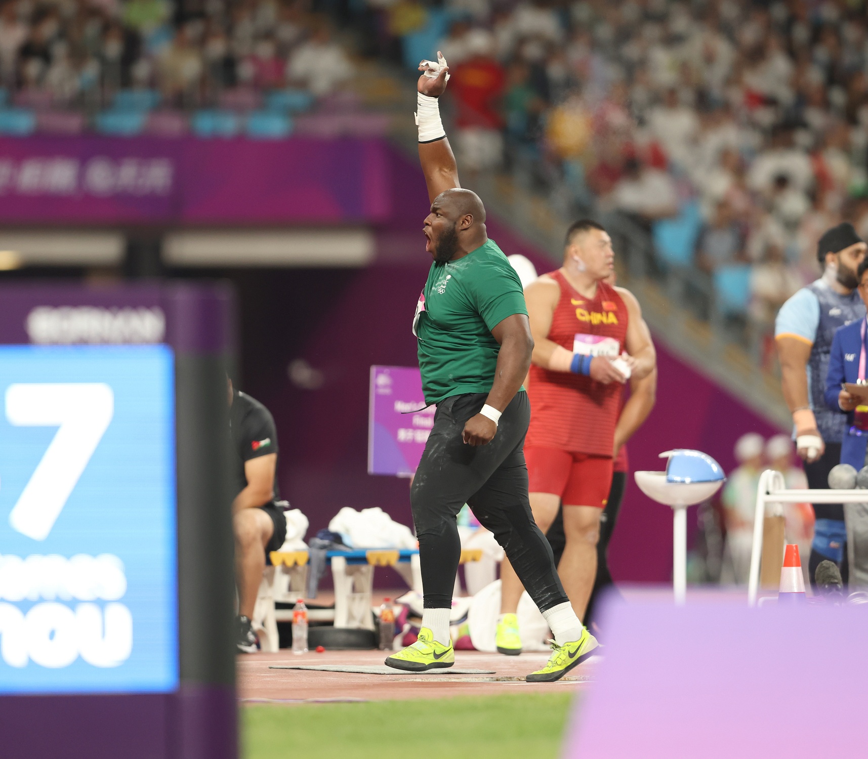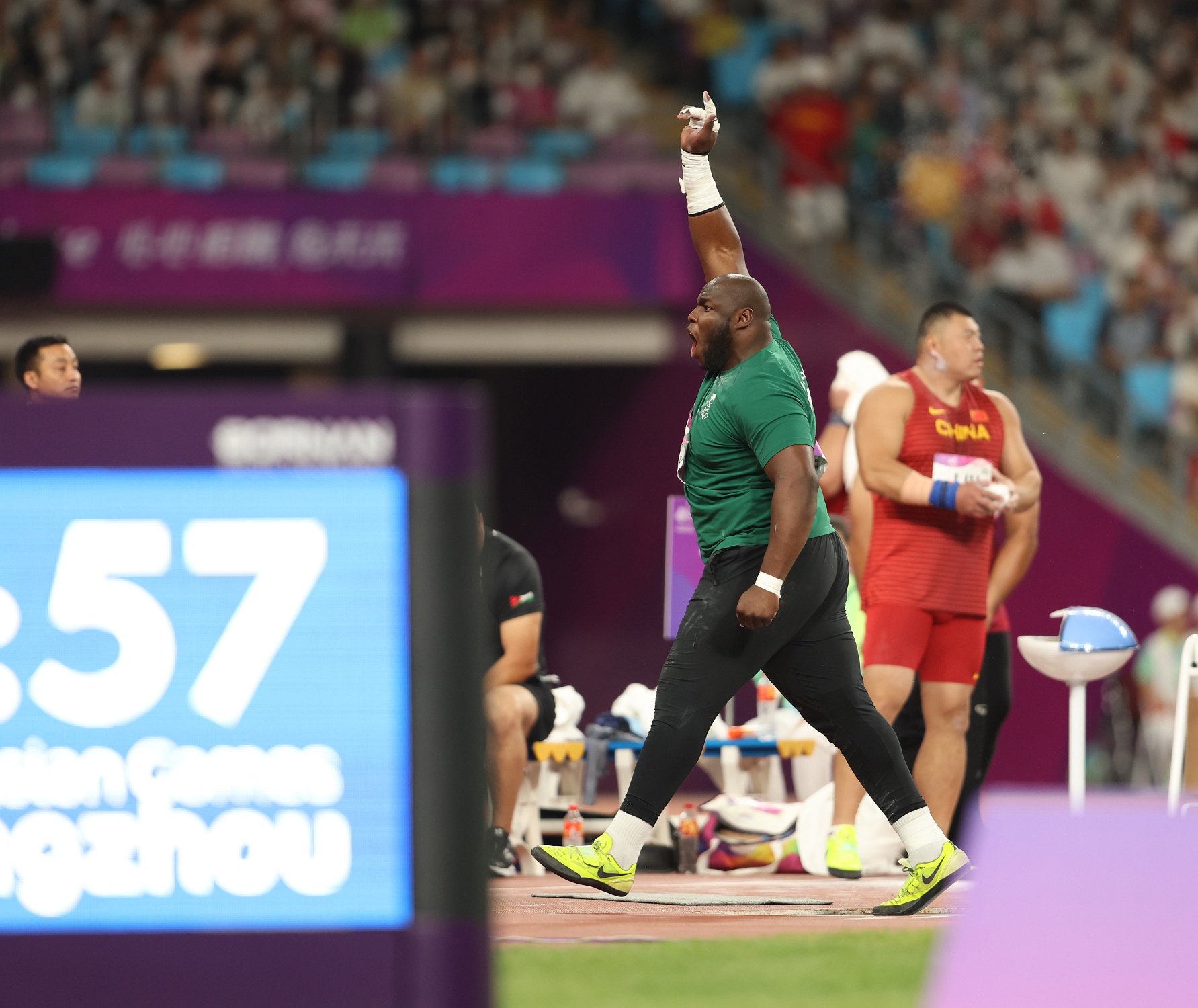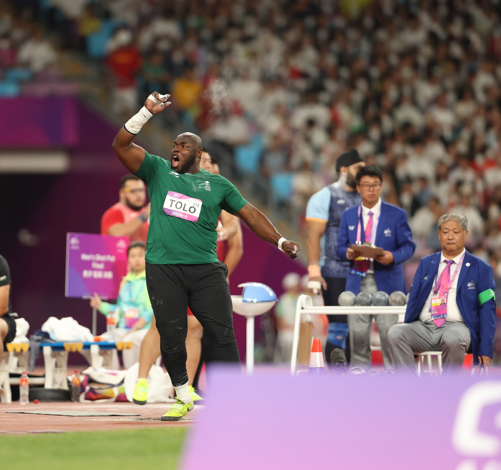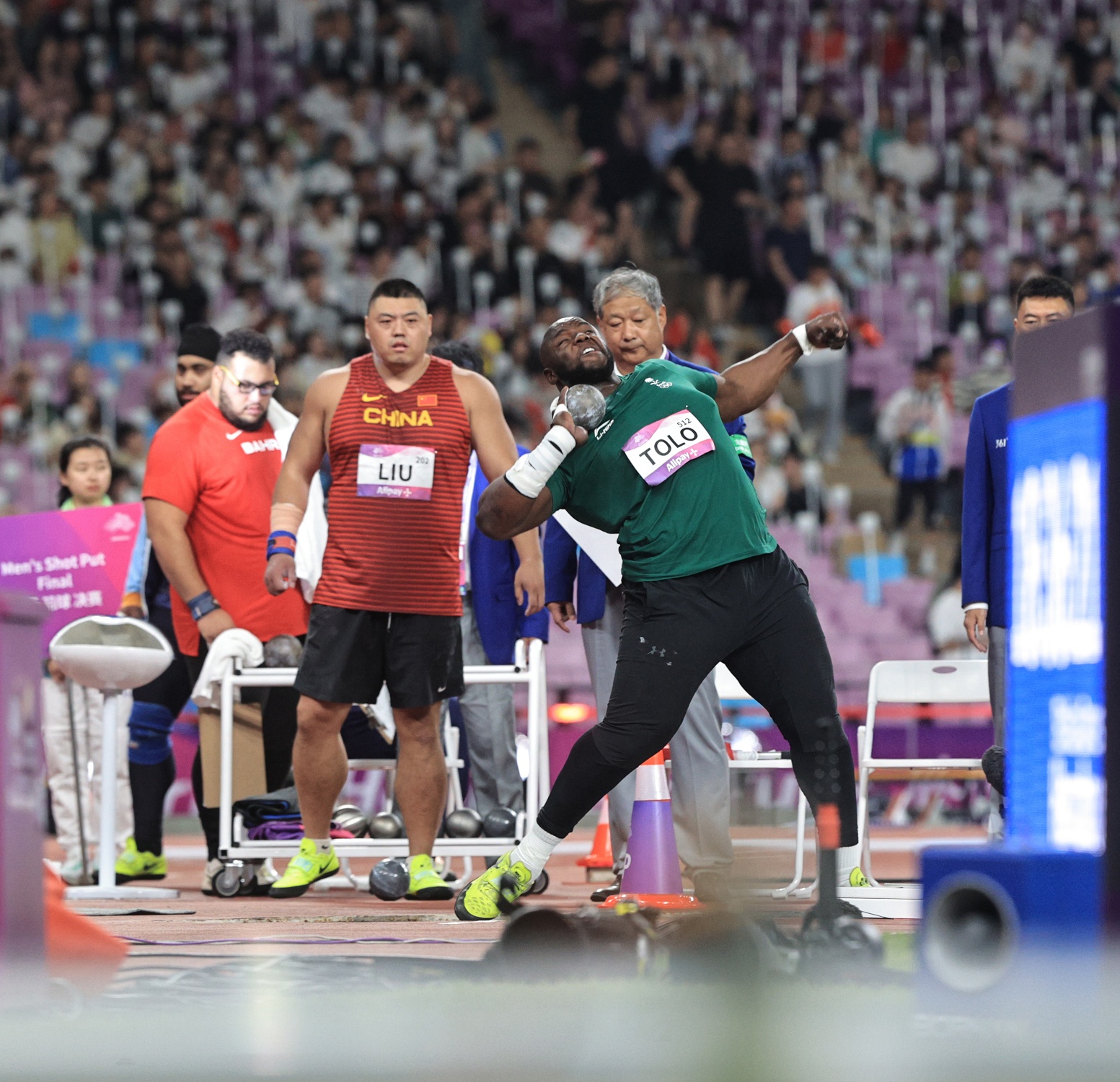 وجاءت الرمية الحاسمة في المحاولة الثالثة عندما رمى لمسافة 20.18م وظل محافظاً على الصدارة؛ حتى المحاولة الأخيرة -السادسة- للهندي “تور” عندما رمى رمية حاسمة منتزعاً بها الميدالية الذهبية بمسافة 20.36م، تاركاً الفضية لتولو، والبرونزية للصيني ليو بـ19.97م.