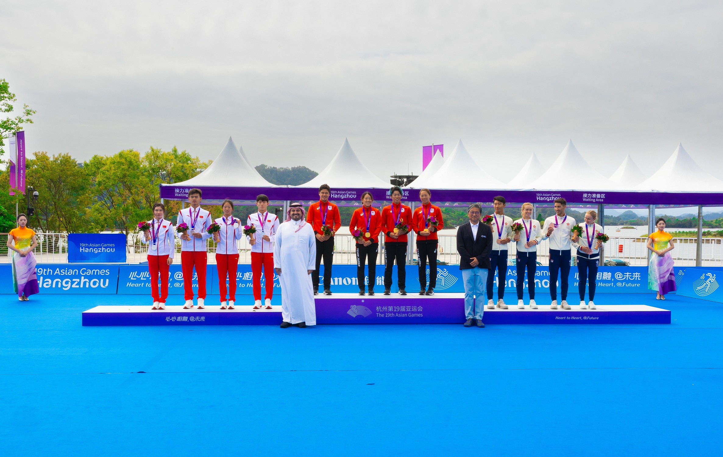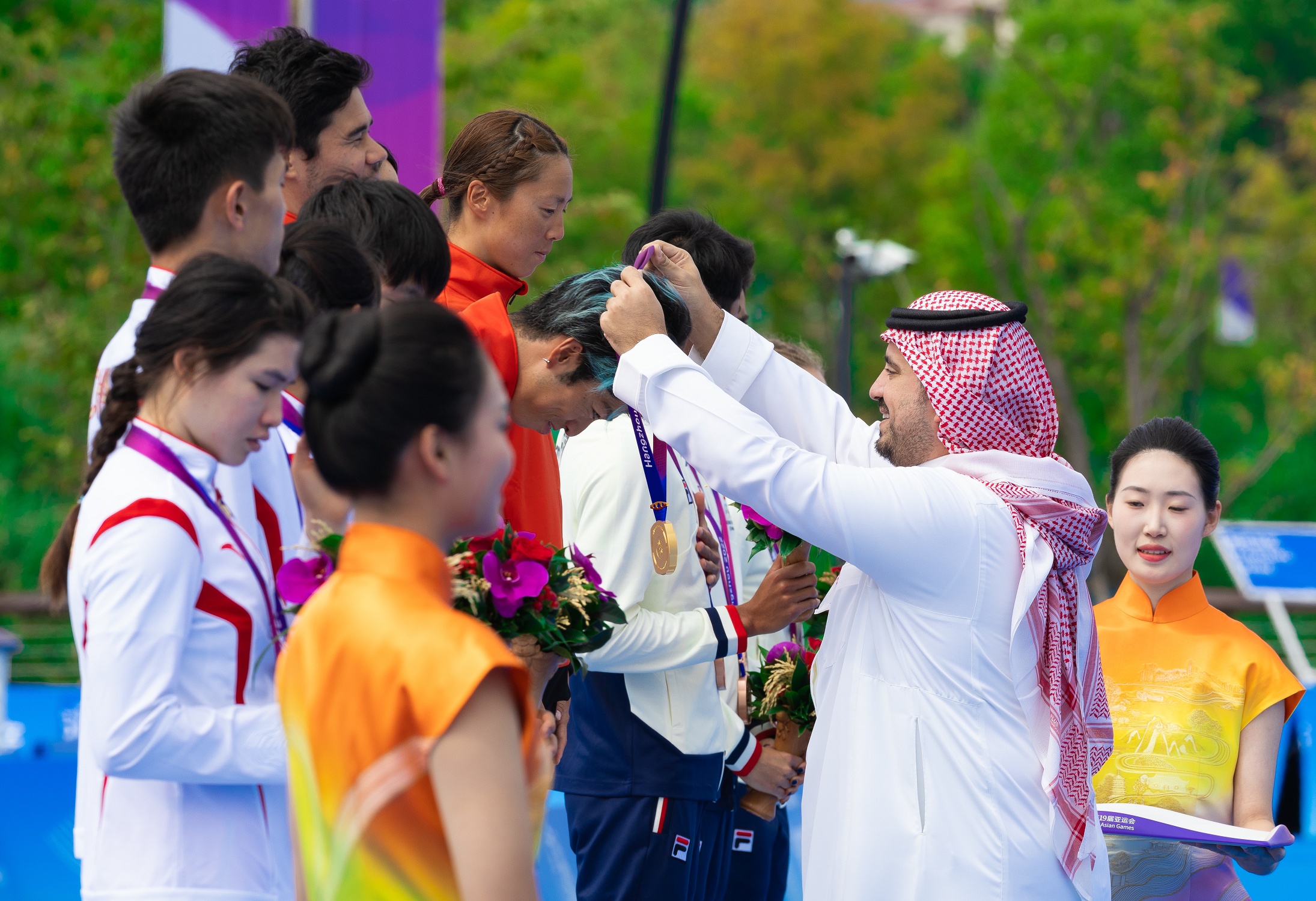 وعلى صعيد آخر، توج سموه، الفائزين في منافسات “الترايثلون” المتنوع، التي جرت منافساتها صباح اليوم ضمن دورة الألعاب الاسيوية.