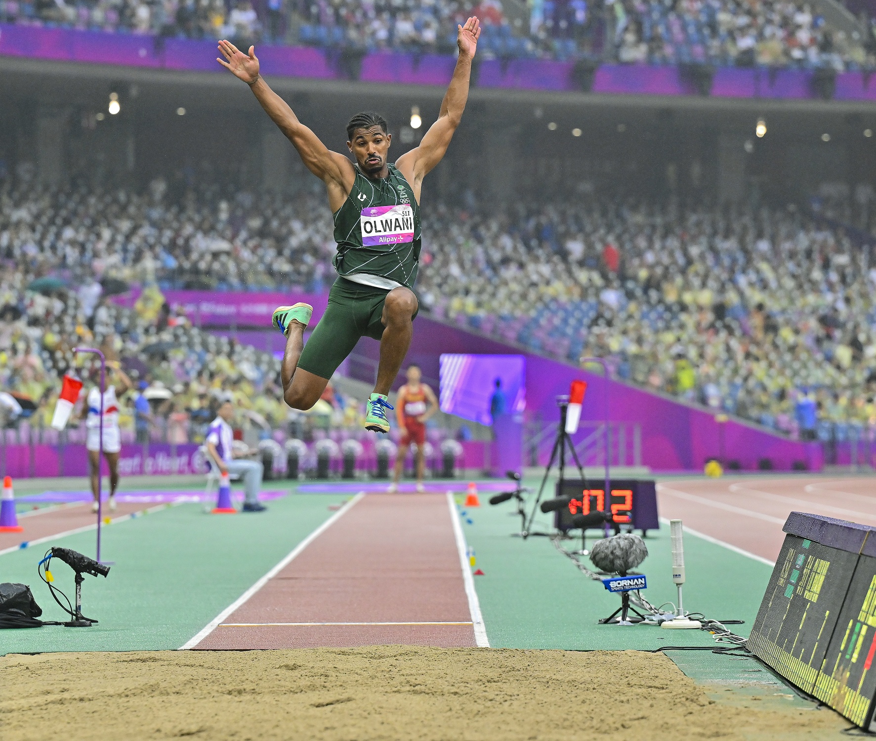ويتواجد زميله الواثب حمود علواني، في نهائي مسابقة الوثب الطويل في تمام الساعة 7:10 مساءً.