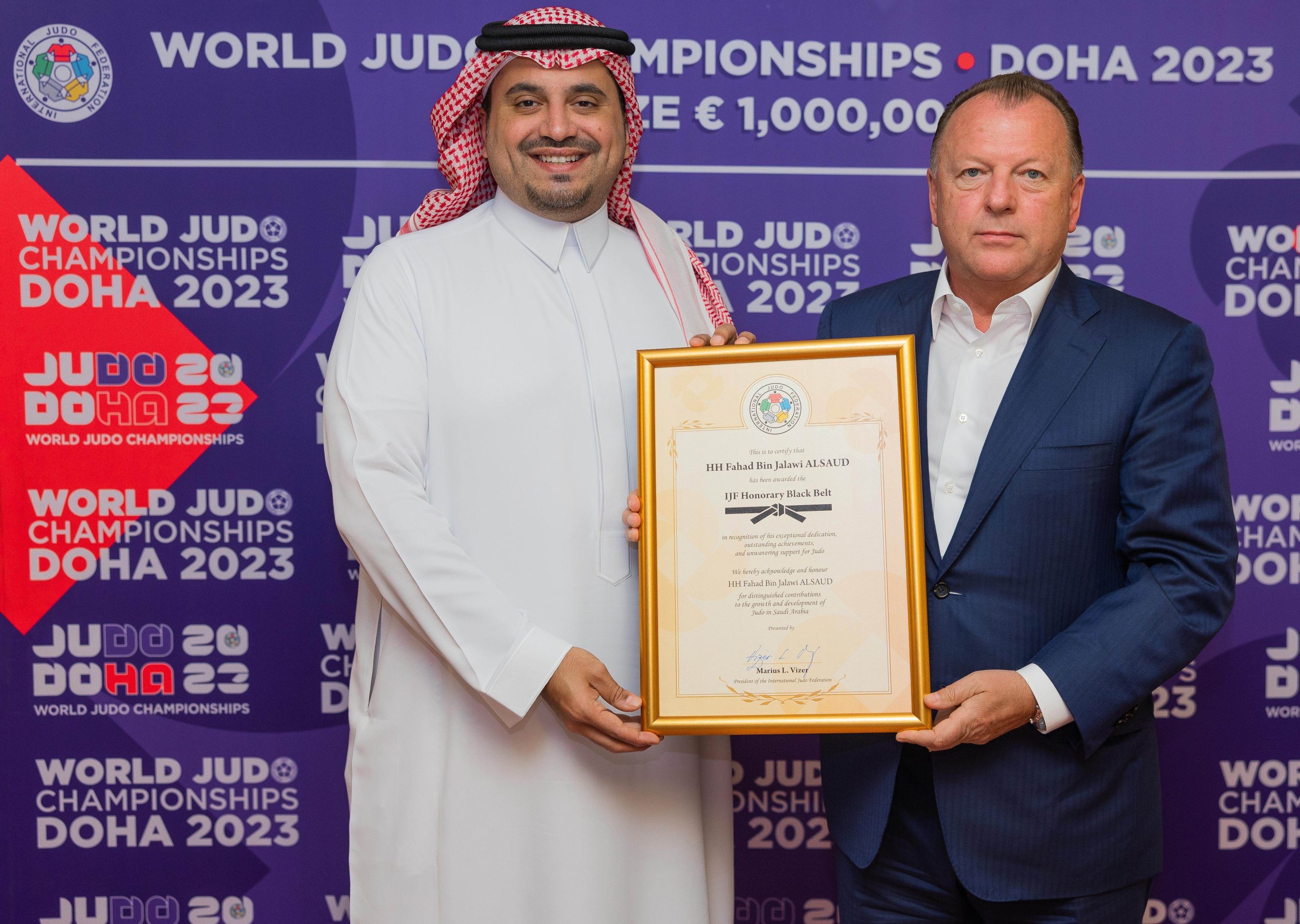 تسلم صاحب السمو الامير فهد بن جلوي بن عبدالعزيز بن مساعد نائب رئيس اللجنة الاولمبية والبارالمبية السعودية اليوم الثلاثاء الحزام الاسود الفخري من رئيس الاتحاد السعودي للجودو ماريوس فايزر على هامش بطولة العالم للجودو 2023م المقامة بالعاصمة القطرية الدوحة.
