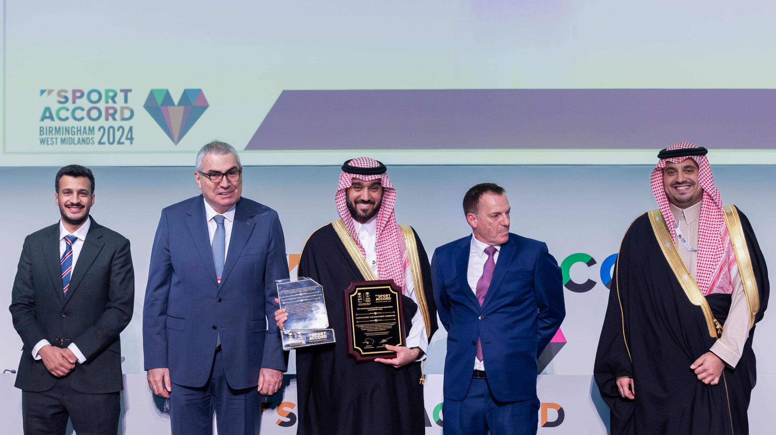 تسلم رئيس اللجنة الأولمبية والبارالمبية السعودية الأمير عبدالعزيز بن تركي الفيصل، جائزة منظمة “سبورت أكورد” العالمية، المقدمة للجنة الأولمبية والبارالمبية السعودية، استثنائياً، أمس الثلاثاء، خلال المؤتمر الرسمي للمنظمة Sport Accord Convention، الذي يختتم غدًا الخميس، في مدينة بيرمنغهام البريطانية، بحضور رئيس اللجنة الأولمبية الدولية الدكتور توماس باخ ورئيس اتحاد اللجان الأولمبية الوطنية السيد روبن ميتشل.